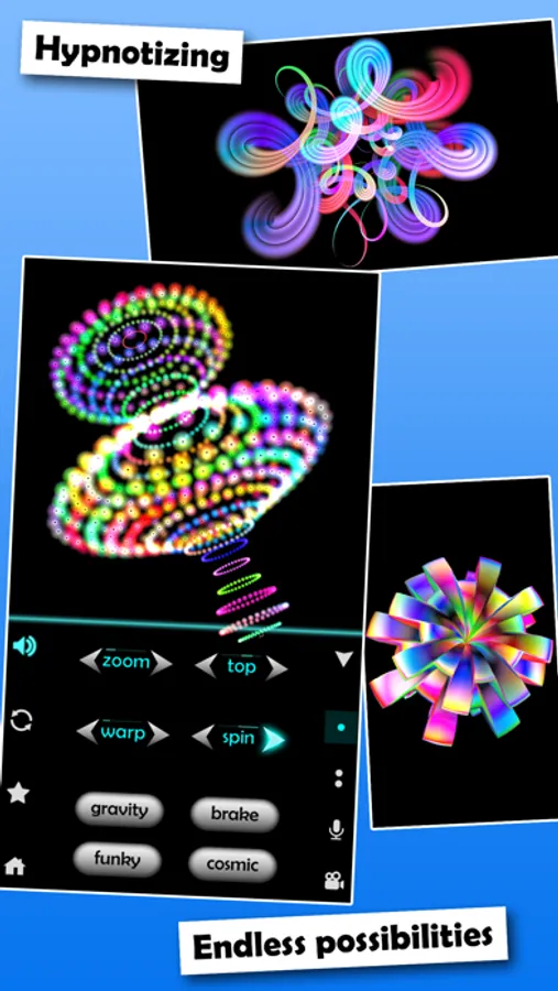 Cosmic Top is a toy, a 3D audiovisual physics simulation of a spinning, wobbling, and morphing top. The top floats among stars and takes on unlimited colorful shapes and sci-fi sounds which glow and hum in stereo from your iPad, iPhone, or iPod touch. Swipe to spin it, pinch to zoom it, or hold to brake it. If you rotate your device, you can see and hear the top from all sides. Record your own spin and tumble sounds and then hear both tracks played back in sync with the motion of the top. Create and share video of your favorite top action. Edit echo effects, color flow, and spin inertia of each top style. Best of all, with a touch of the cosmic button, a new cosmos of sight and sound will be created for you to explore.