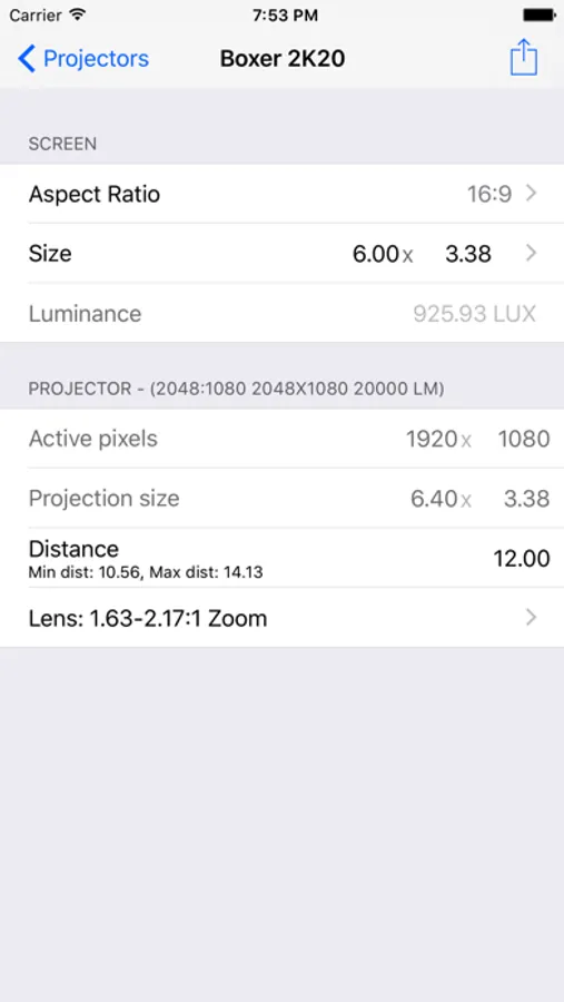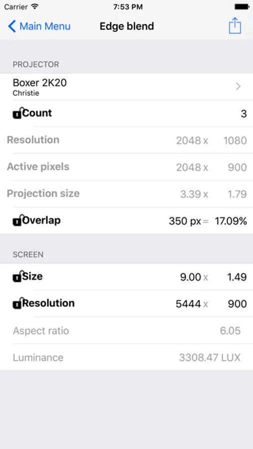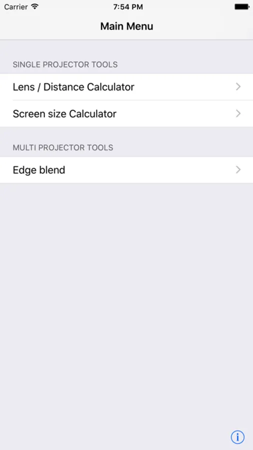 The app can be used to calculate projector lens & distance at a given screen size, or calculate screen size from a given distance & lens for a particular projector. In addition basic edge blend calculations can be made.