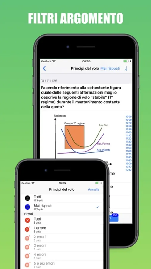 - Possibilità di visualizzare per ogni argomento i quiz mai risposti ed i quiz errati organizzati per numero di errori;