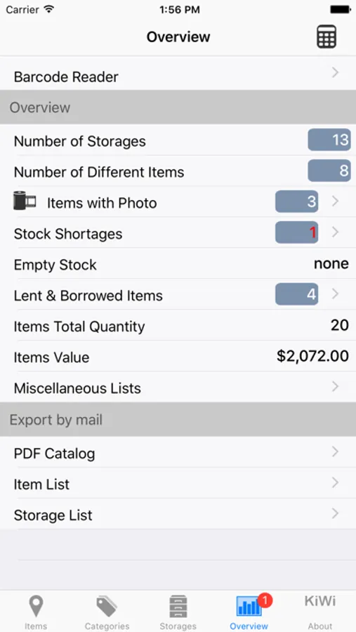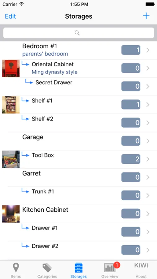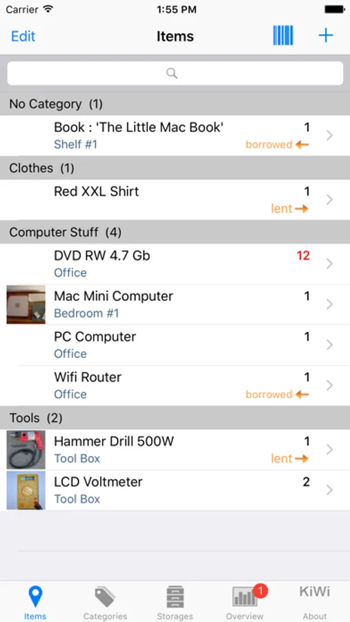 Catalog the items you hold dear, associate them with categories and storage places. Keep track of items you lend or borrow, as well as how many are currently in your possession.