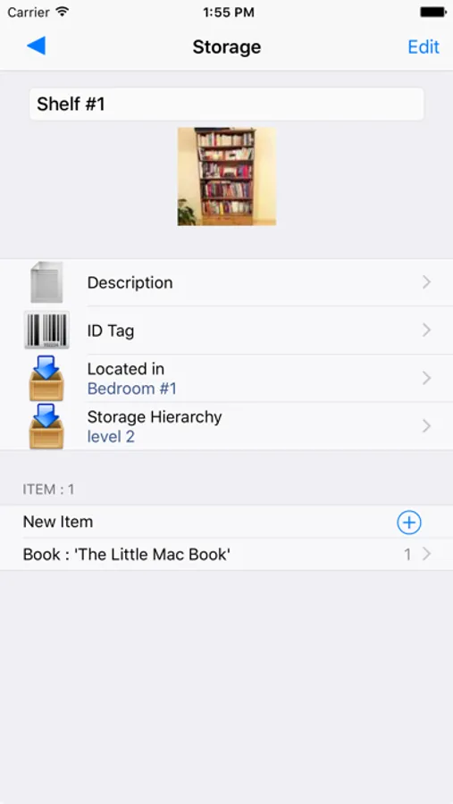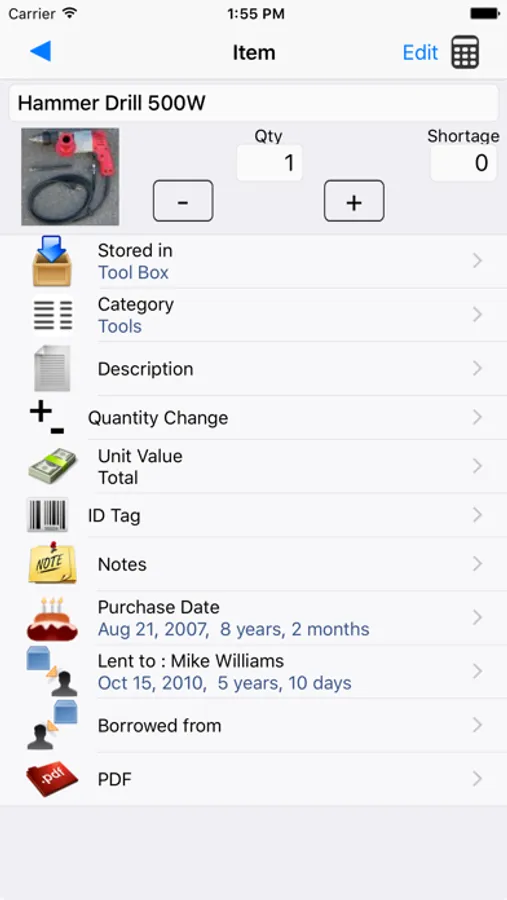 eStorage allows you to catalog any items you want to: household items, tools, goods, documents, collections, etc. There’s no limit to how many item categories can be entered. Each new item can be given a name, description, value (useful for insurance), picture and quantity (set to 1 by default).