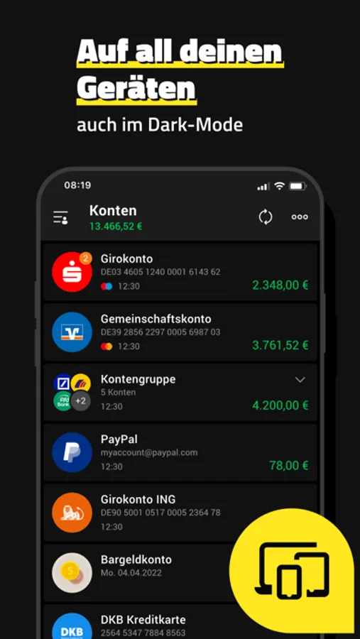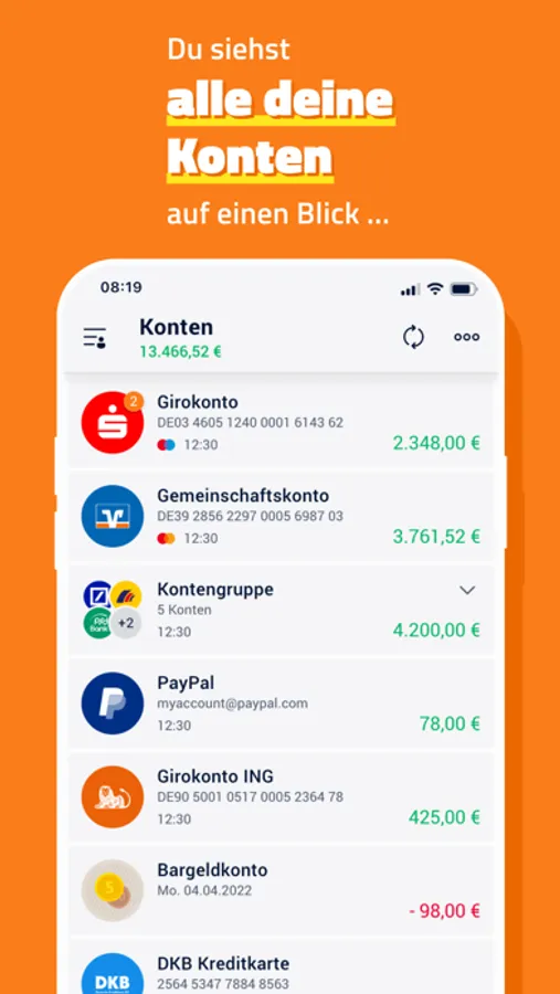 - Anzeigen von Salden, Umsätzen und Vormerkungen deiner Konten und Kreditkarten