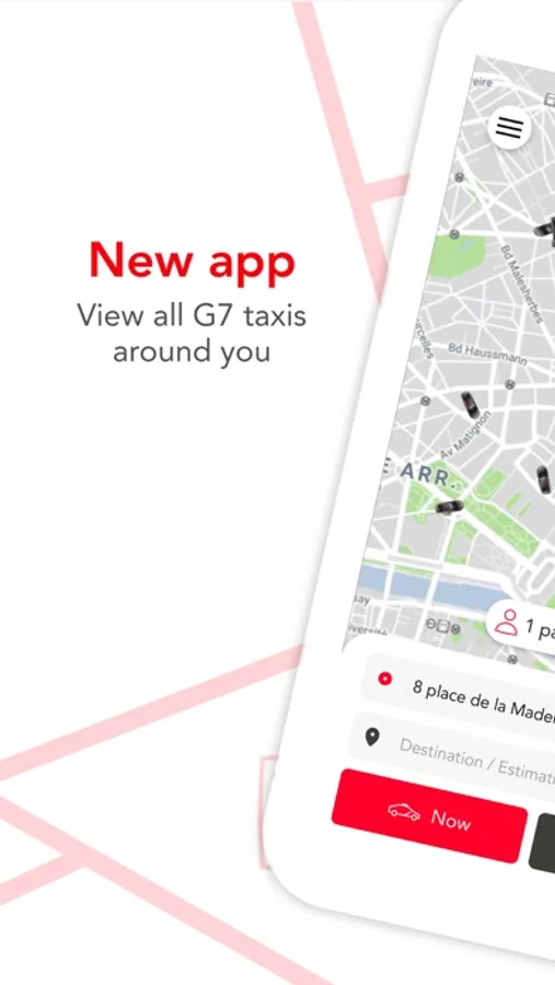 o Launch the app, you are geolocated, indicate the number of passengers to benefit from the most adapted service, tap on "Now" to book a G7 where you are, or "In advance" for a request up to 30 days in advance