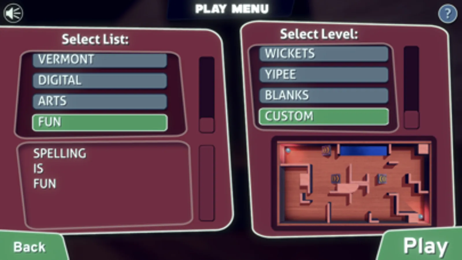 Choose from a variety of pre-loaded spelling lists or add your own. Points and achievements are awarded based on the sequential collection of letters to correctly spell a word, the speed by which the letters are collected and the number of correct letters collected in a streak. Points are never subtracted from the score but bonus streaks are reset when an incorrect letter is hit and/or when the game timer expires.