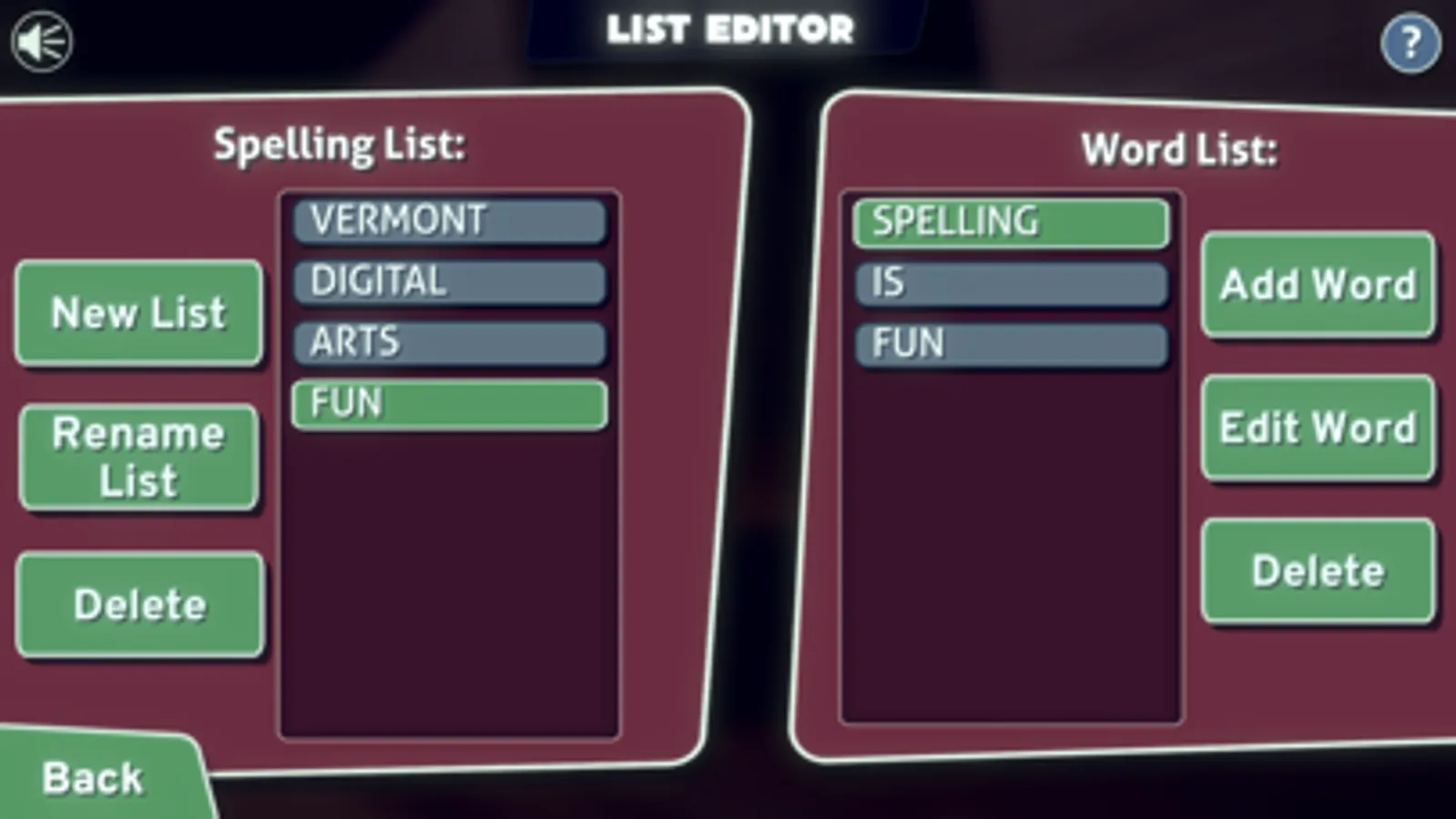 Spelling List Editor: Create, save, and play your own spelling lists. Use your child’s spelling lists from school and make studying fun!