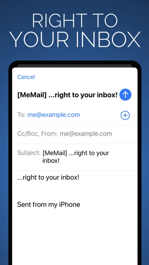 MeMail does one thing exceptionally well: send quick emails to a pre-set address. Email yourself reminders or notes? Just launch, type, and send — that's it! No fishing around for the right contact. Simply set your address the first time you open the app and you’re good to go.