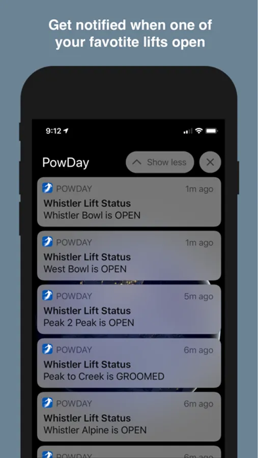 PowDay also notifies you of chair openings so you don't have to wait in lift lines. Set the app to notify you to send you a notice as each chair opens, like a best friend standing in line who calls you when loading begins.