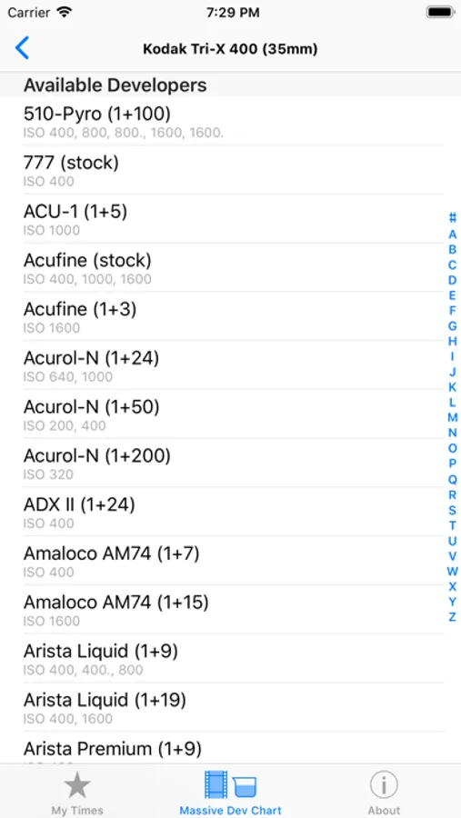 The Massive Dev Chart is the world's largest film development chart with easy to use multi step timer and darkroom support for iPhone, iPad and iPod Touch. Watch the instructional video at: https://www.youtube.com/watch?v=P915z6THiY8.