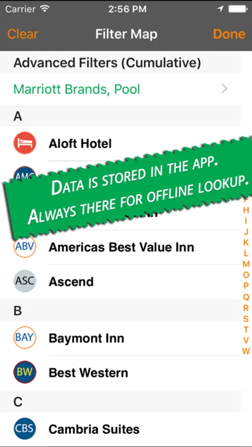 Do you have favorite hotel chains? This universal app makes it easy to find chain locations nearest you (or far away). With or without service. No waiting for data, ads or being thrown in a queue.