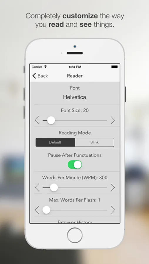 • Customization, including words per minute (WPM), words per flash, themes, fonts and font sizes