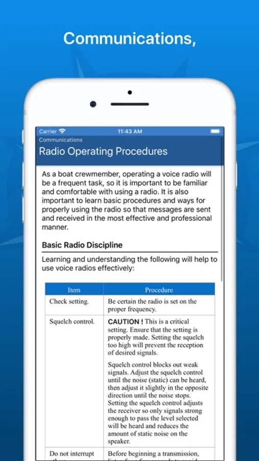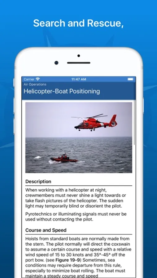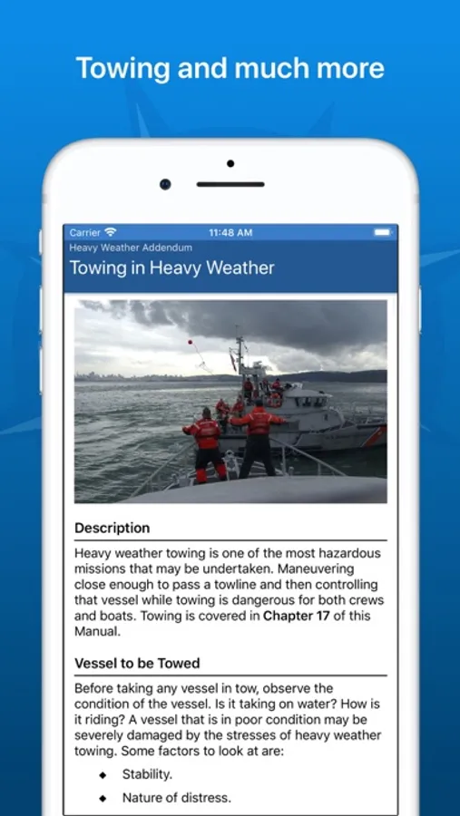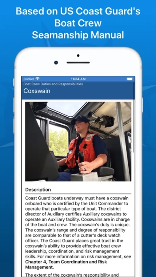 The app incorporates and standardizes the current best practices employed within the Coast Guard boat operations community. It is the primary reference for the Boat Crew Training Program and shore based boat operations and seamanship training.