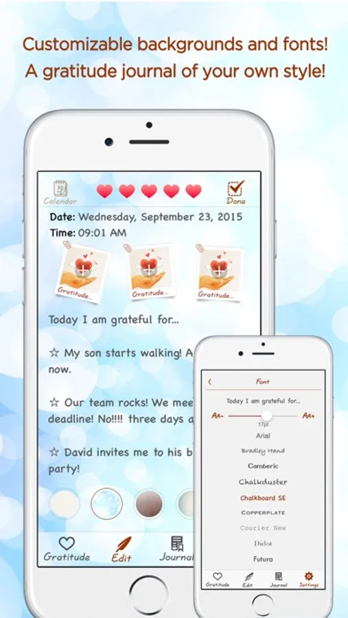 It’s your gratitude journal so it should reflect your own style. Customizable backgrounds and fonts are just taps away. You can even share your journal with your friends on Facebook.