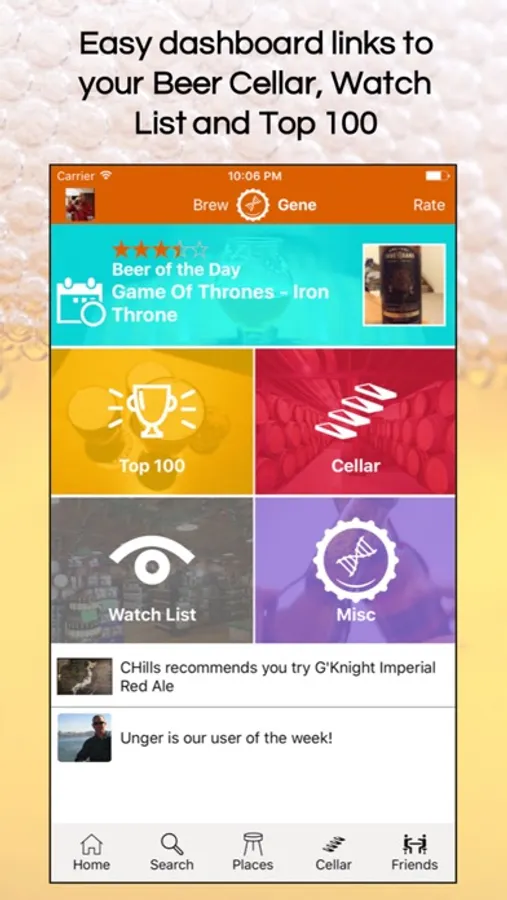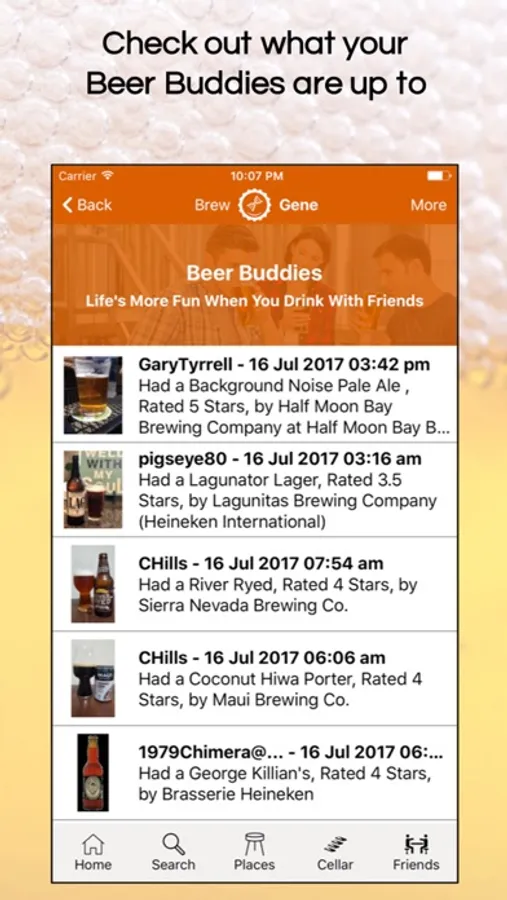If you're the type of person who likes to post pictures or talk about your favorite beers, we've hooked up BrewGene to Twitter, Facebook and Foursquare. We've also built a Beer Buddy system that allows you and your friends to easily see each other's tasting notes, beer activity, and offer personalized beer recommendations. For instance, if you need to get your buddy some beer for their birthday, you can search and see their favorite beers.