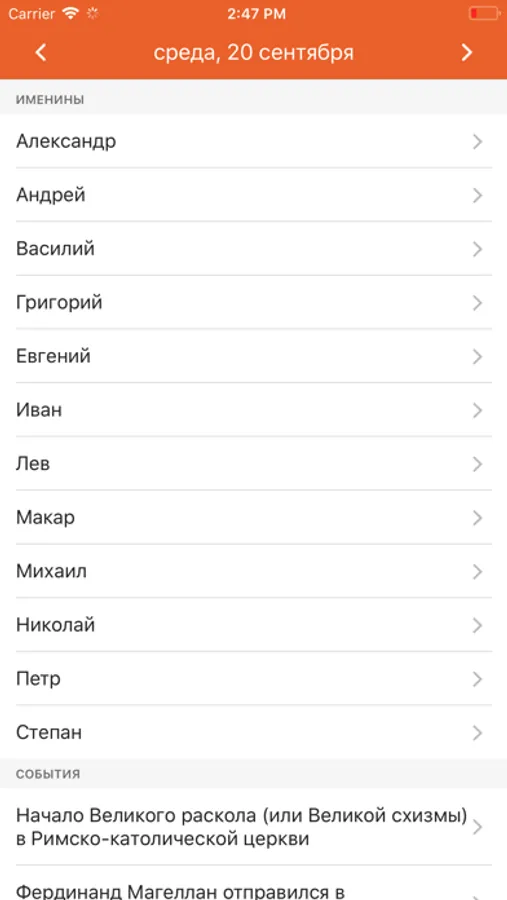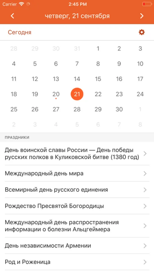 «Календарь праздников» — легкий и удобный гид по памятным событиям на любой день в году. Приложение предоставляет доступ к базе портала Calend.ru, содержащей наиболее полную информацию на русском языке о праздниках, памятных датах, именинах, датах рождения и смерти известных личностей, днях городов практически всех стран мира.