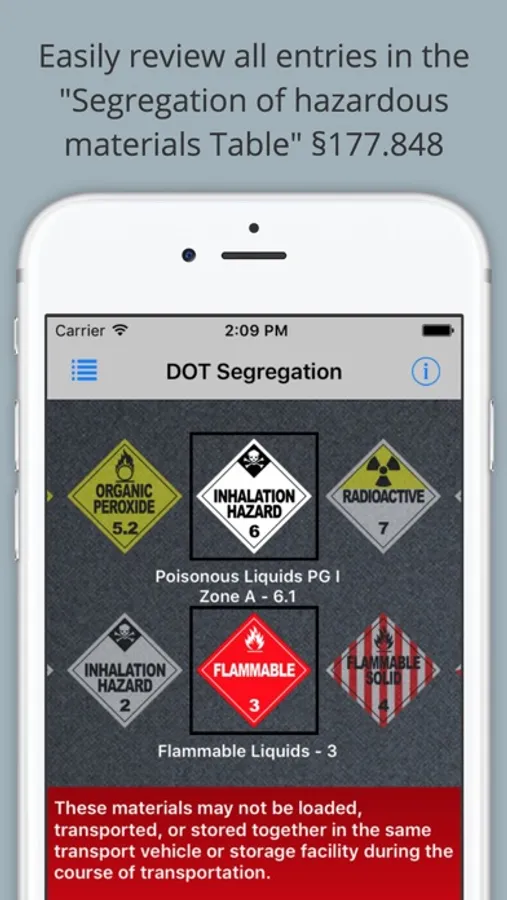 The information presented in this app can help the hazmat employee training requirements by supplementing knowledge with a quick and easy to use interface.