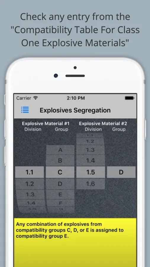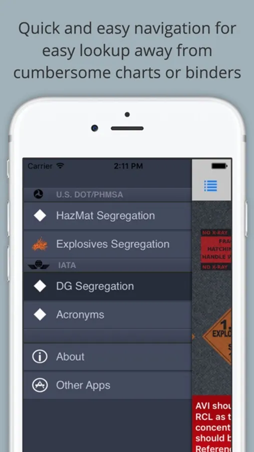 This app utilizes the "Segregation for Hazardous Materials" and "Class 1 Explosives Compatibility" Tables found in DOT/PHMSA Hazmat and IATA Dangerous Goods (DG) Handling Regulations.
