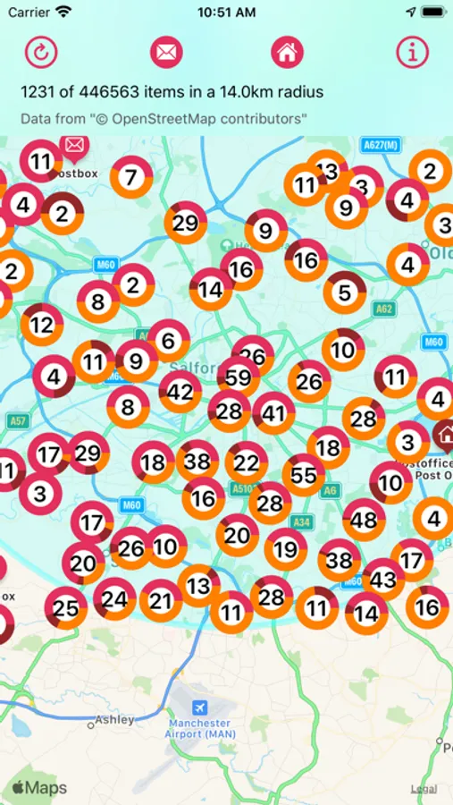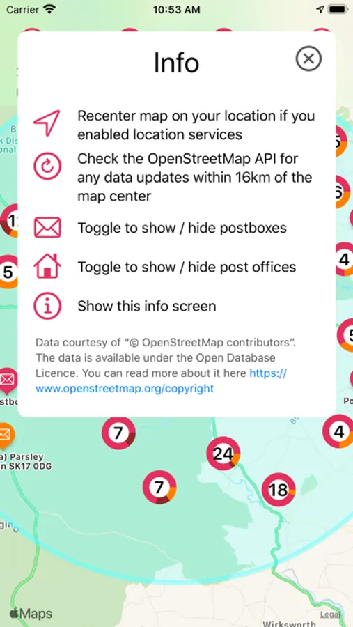 There is a whole new interface to the app that allows you to request data updates from OpenStreetMap within 16km of the centre of the map, you can now use toggles in the top menu to allow you to filter to only see postboxes, post offices or both. There is new clustering functionality in the map interface so that you can better see the information on the map, and a new circular radius overlay that helps you see clearly the area that you are currently viewing postbox data within, since we cannot place all 400,000+ data items on the map at once.