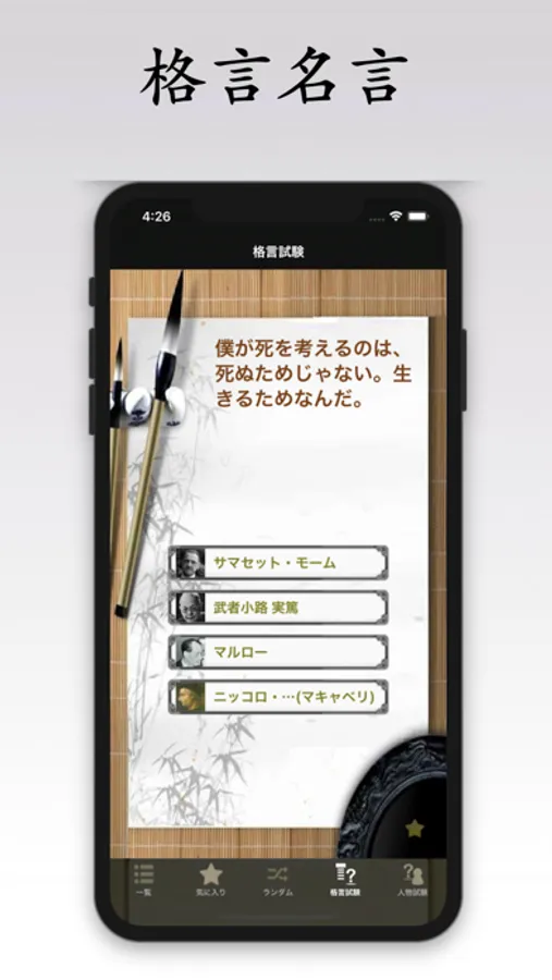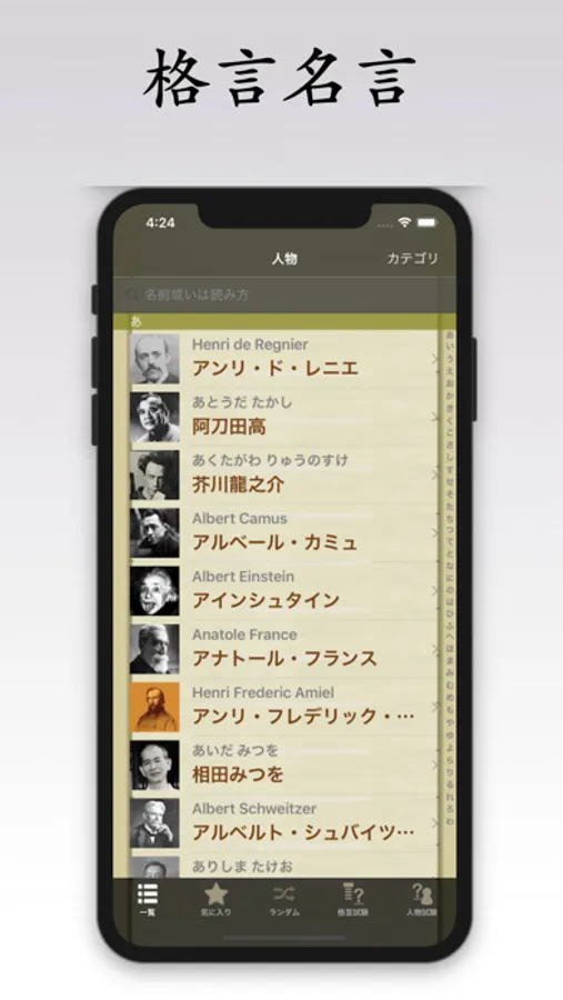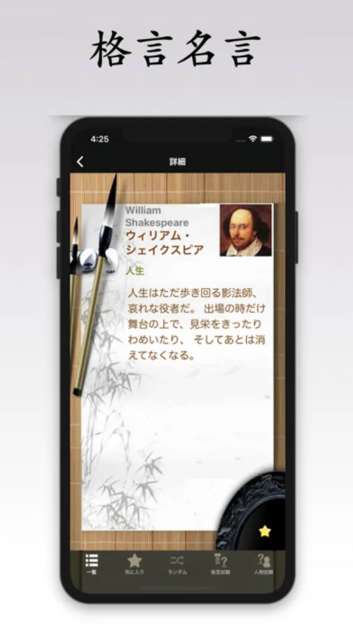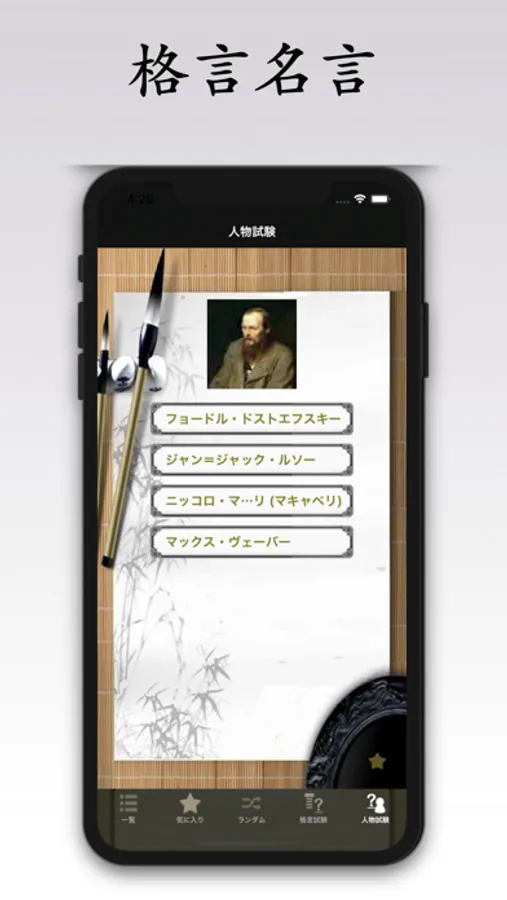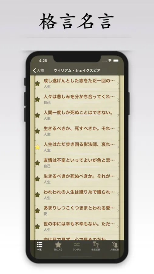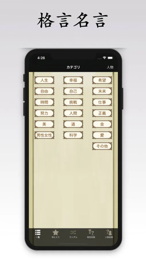 本アプリは世界傑作格言を収集して、作者別・50音順或はカテゴリに掲載しております。格言に対して自分の感想の作成、格言のランダム表示、あとは格言のテストと人物のテスト機能もあります。特に、画面をイメージとして写真アルバムへ保存し、iphoneの壁紙に設定することもできます。