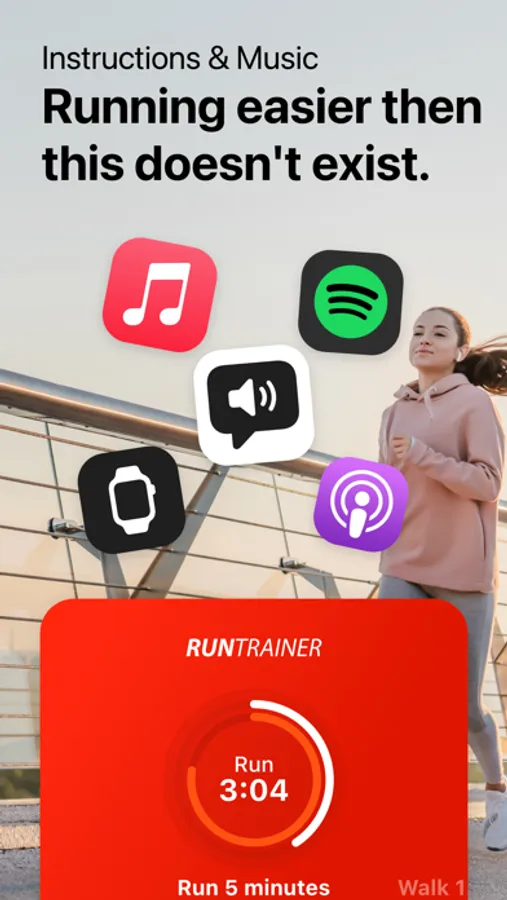 Run Trainer offers coaching/training using human voice fragments. Want to listen to music? No problem! You can use Apple Music, Spotify, Podcasts, and other music apps during the run and the app will automatically mute the music when necessary so that you can hear the instructions.