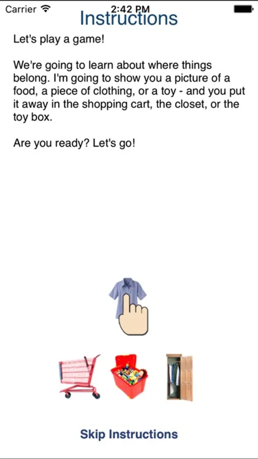 This interactive game develops language, reasoning, and sorting and classifying skills in your learners. Players must "clean up" by putting 75 photographic images of toys, food, and clothing away in the correct shopping cart, refrigerator, or toy box. Each target is introduced by its label ("Where does the Apple go?") in each round where players see 15 unique images. Correct responses receive visual and auditory reinforcement while incorrect answers are corrected by a visual prompt of the correct answer flashing. After all targets have been seen once, they are reintroduced in a new, randomized order. The App takes data for the percentage answered correctly across rounds as well as sessions in which the App is in use. This app builds foundational sorting skills for students just developing their sorting and classifying skills.