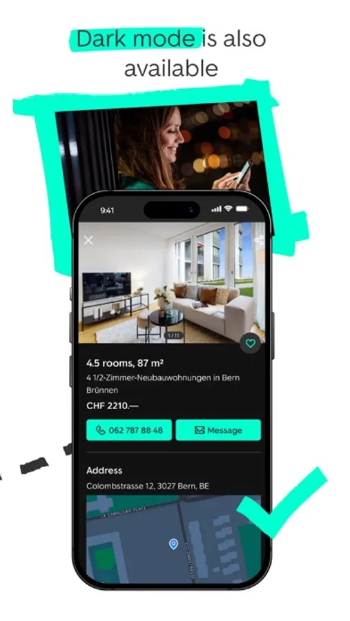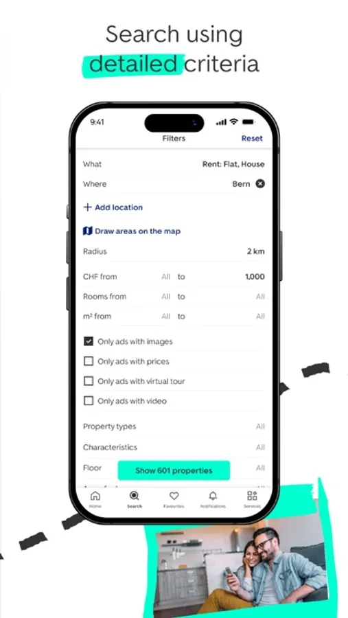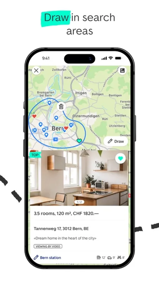 ImmoScout24 is an all-in-one marketplace for finding your ideal property in Switzerland. Buy your dream house or rent an apartment. With more than 84,000 houses and condominiums and rental apartments, you have a lot to choose from. From affordable one-bedroom apartments in Lugano and terraced houses in Bern through to lofts in Zurich and duplex houses in Lucerne, there’s something to meet your every need. And you can, of course, also create listings for your own properties! Would you like to find out more? Here you’ll find detailed information about our app’s most important features.
