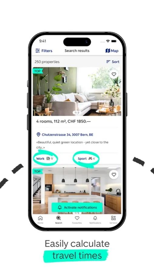 Our app shows you the commuting and travel time to these places in each of the search results – have the commuting time calculated for you!