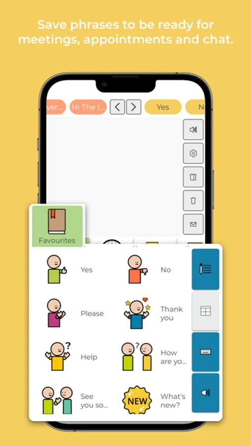Save phrases that you need quick access to - for appointments, school or work. You can edit them and add new ones that you might find useful. Use the phrases with or without symbols, depending on what you find easier. It is possible to attach videos, images, and message-banked files. You can arrange the phrases in a grid set-up, which may support earlier AAC users.