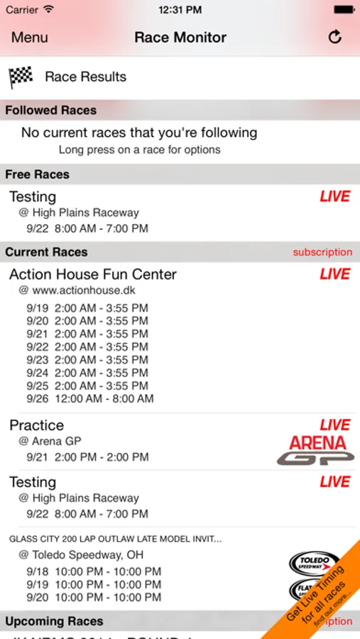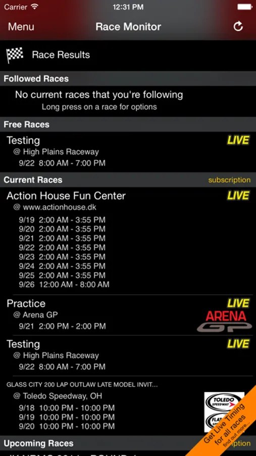 An in-app upgrade to Race Monitor Plus is available which will unlock additional features including a Heads Up Display for racers (includes historical lap times), and Racer Alerts to let you know when a racer you're following goes on track.