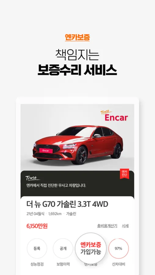 • 딜러나 보험사를 통하지 않고, 엔카가 100% 책임지는 중고차 보증수리서비스
