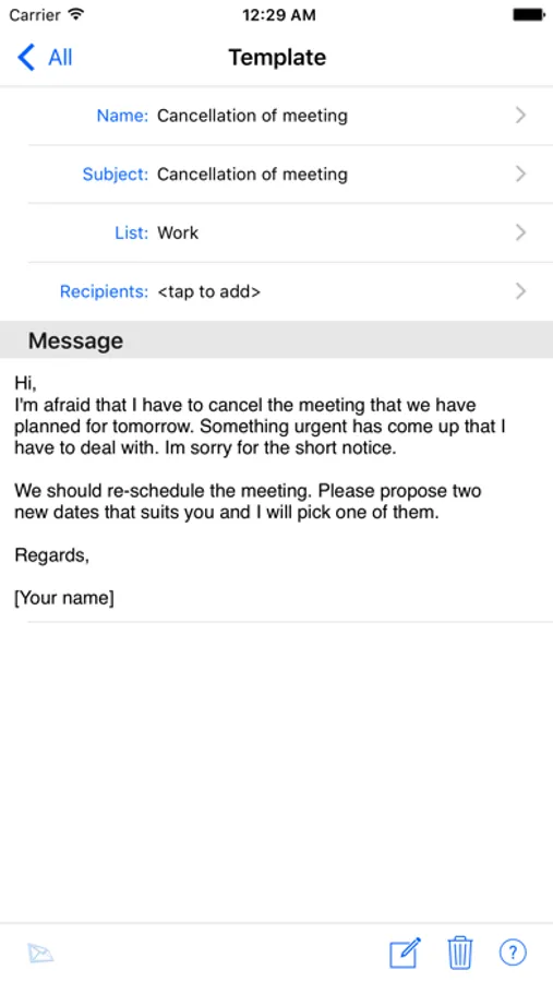 This app is ideal for individuals that send the same type of email & SMS/text messages regularly, such as sales people, persons that arrange meetings and events on a regular basis etc. It is also very useful if you often send out SMS messages like “I’m running a little bit late but will be there in 10 minutes”.