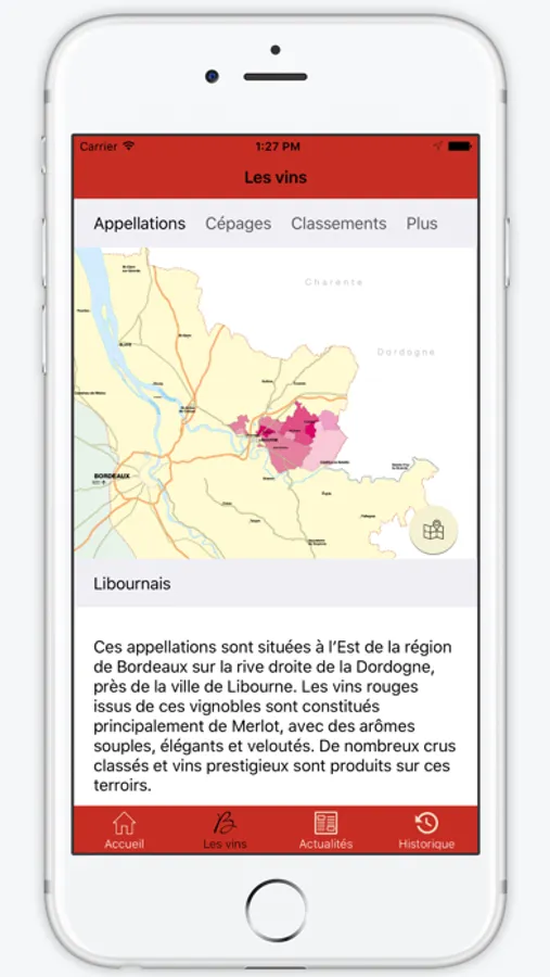 - access to Bordeaux wines' informations: AOC, grape varieties, standings