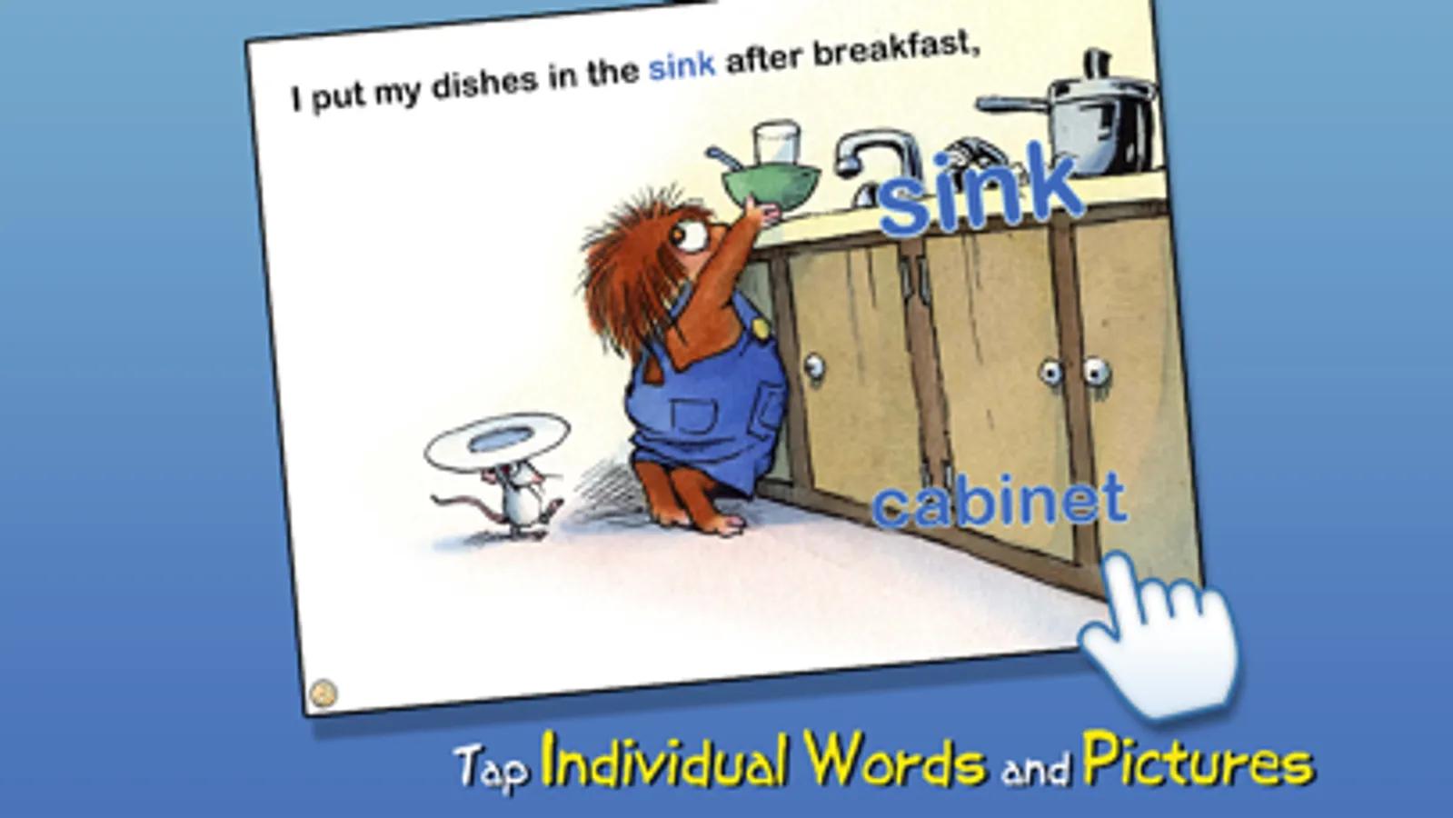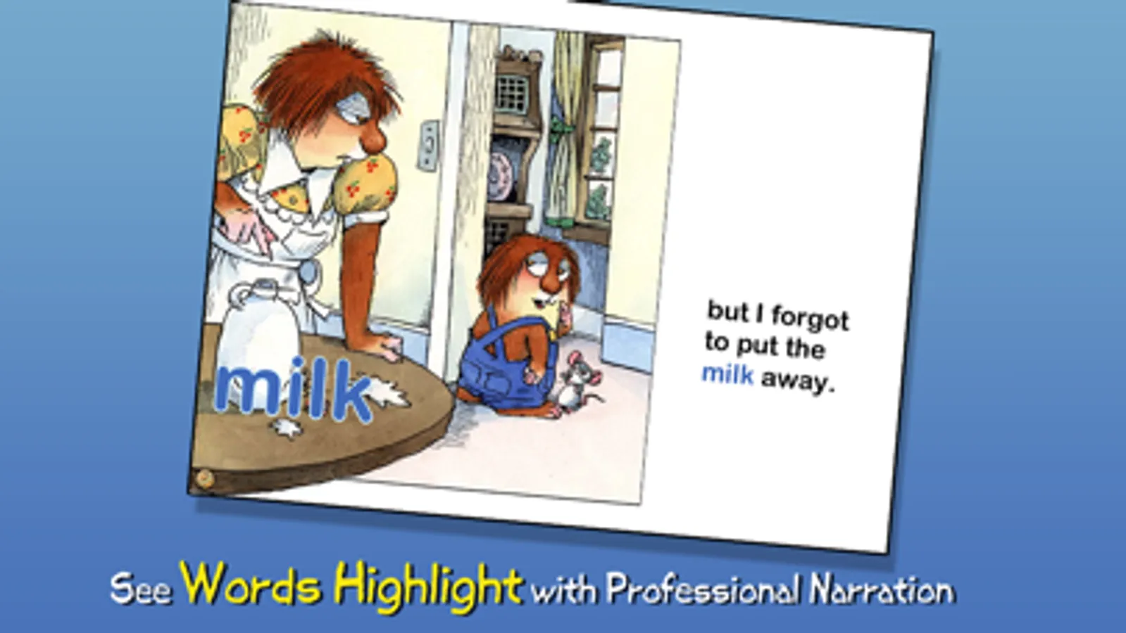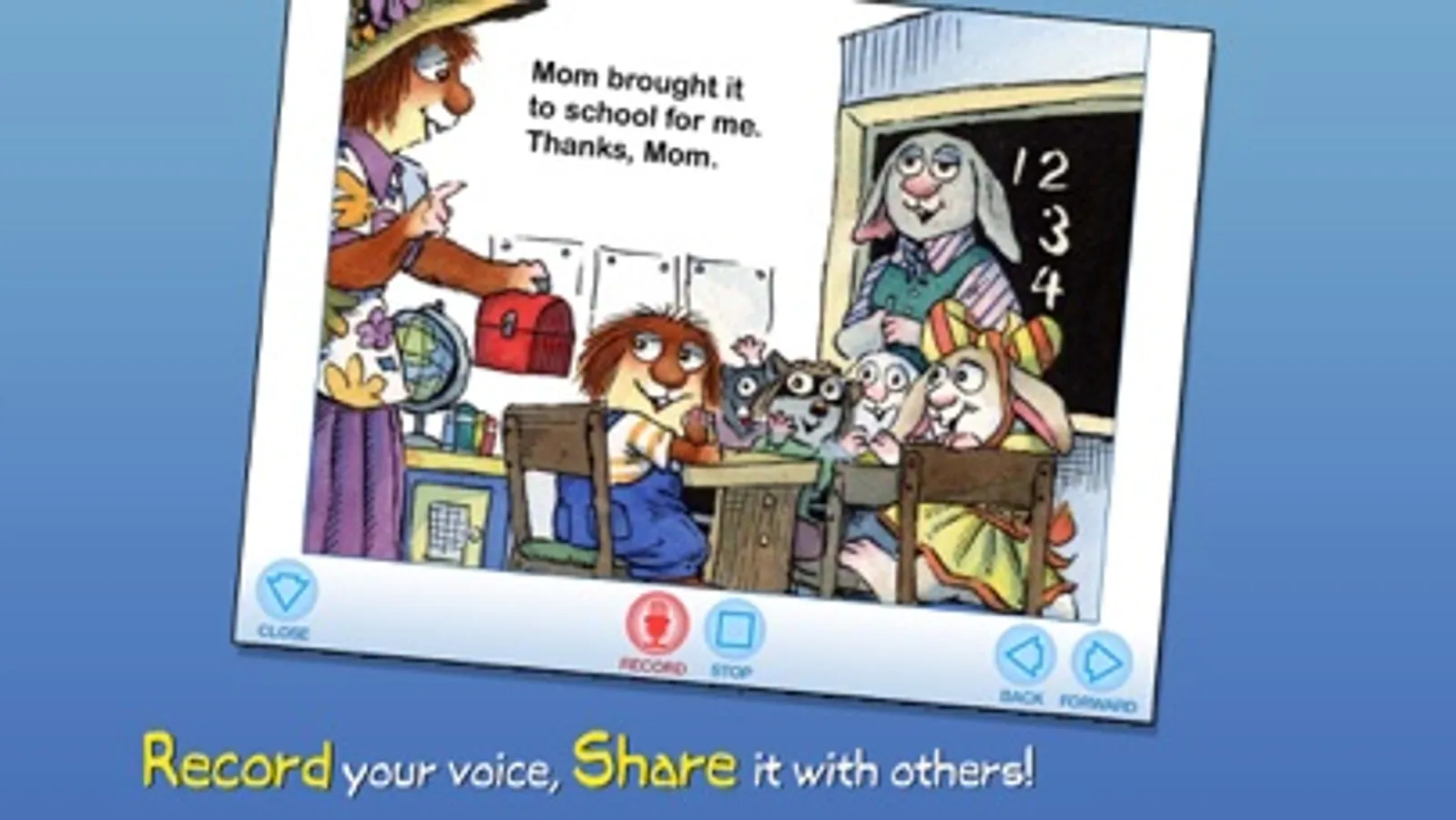 Join Little Critter in this interactive book app as he tries hard to get through his day without forgetting anything! Explore pictures, learn new vocabulary, and personalize the story with your own narration. Every young child will understand Little Critter's confusion and laugh with him from start to finish!