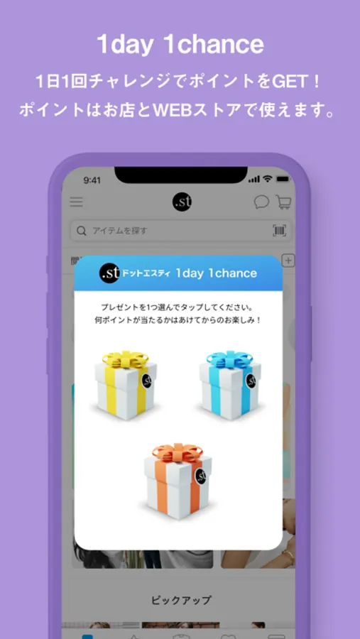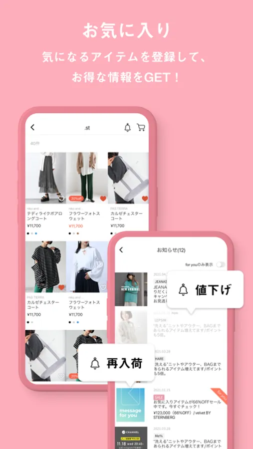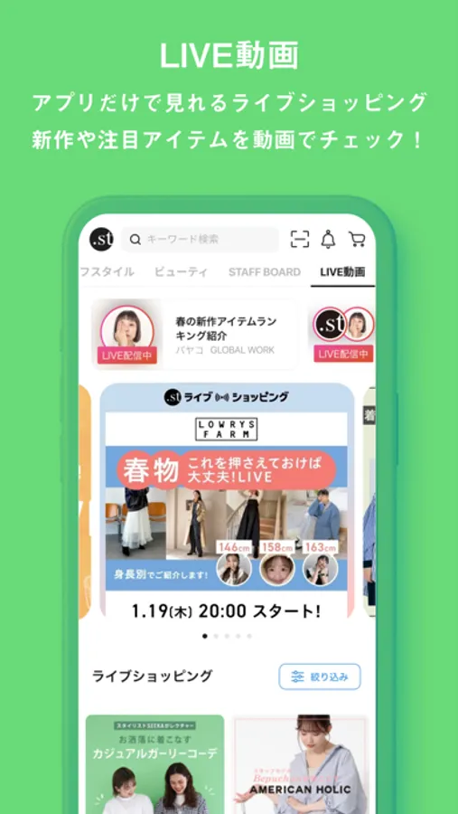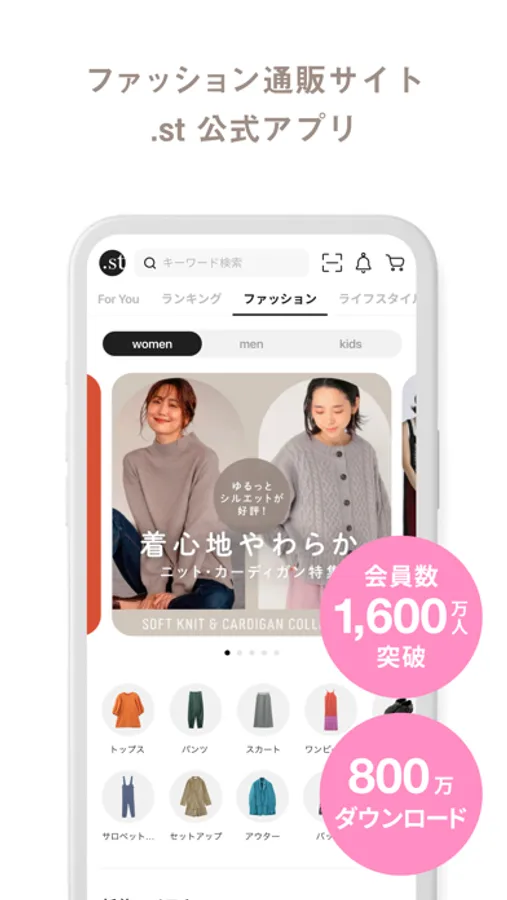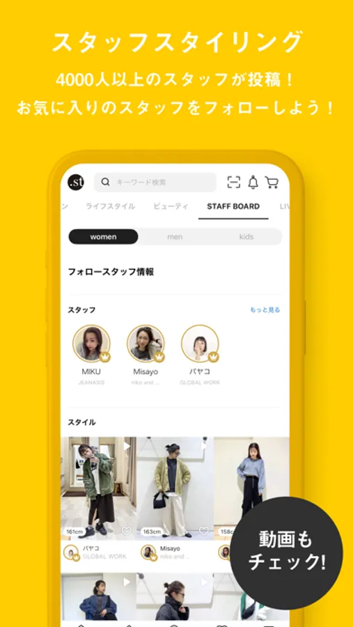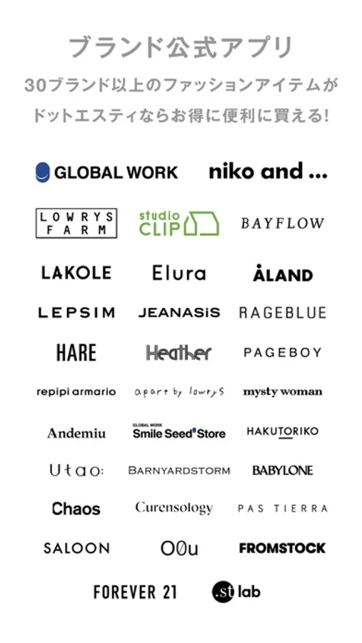 GLOBAL WORK , LOWRYS FARM , niko and ... などのブランドが集結したファッション通販サイト「.st(ドットエスティ)」の公式アプリ。