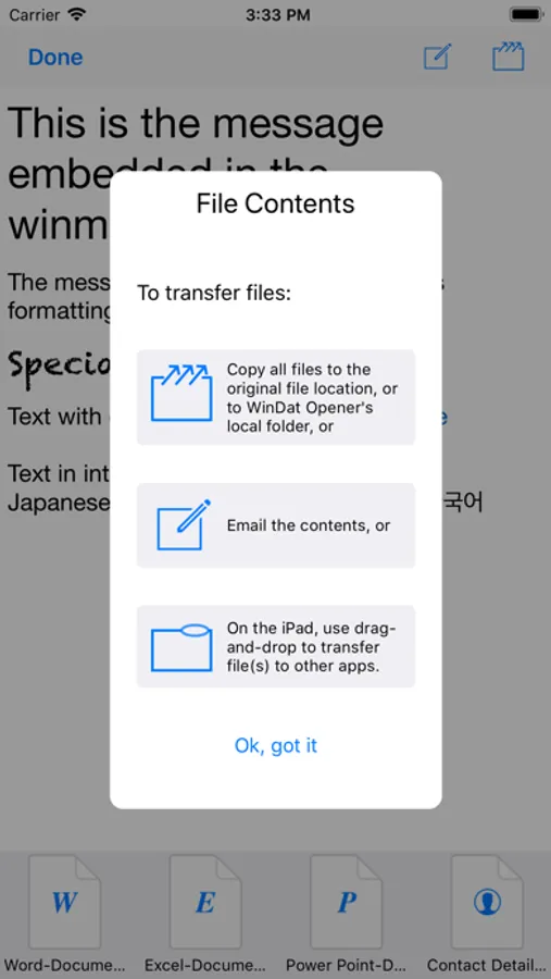 WinDat Opener is simple to use - it integrates transparently with Mail on the iPhone, iPod Touch or iPad at operating system level, and has it's own integrated file manager that gives you access to locations on your device, and cloud storage provides such as DropBox and iCloud. Once WinMail Opener is installed, all you have to do is to touch any winmail.dat file, and the app you're using will offer to send it to WinMail Opener for the embedded attachments to be extracted. You can then view the extracted files using Winmail Opener’s built-in file viewer, which supports a wide variety of document formats including doc, docx, xls, xlsx, ppt, pptx and PDF, as well as most image formats such as JPEG and TIFF. If you have an application installed on your device that can edit or view an extracted file, e.g., Pages for doc files, you can open any extracted file in that application. WinDat Opener also offers the option of emailing the extracted files, right from within WinDat Opener.