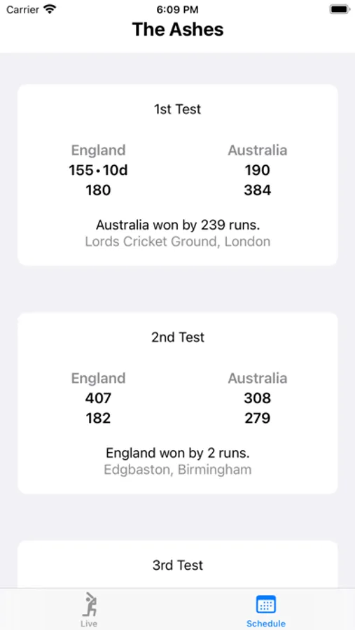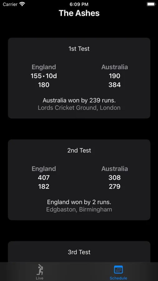 Scores are updated in realtime and alerts are sent for every wicket, hundred and fifty.