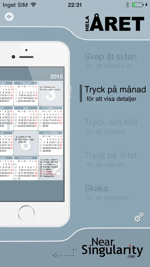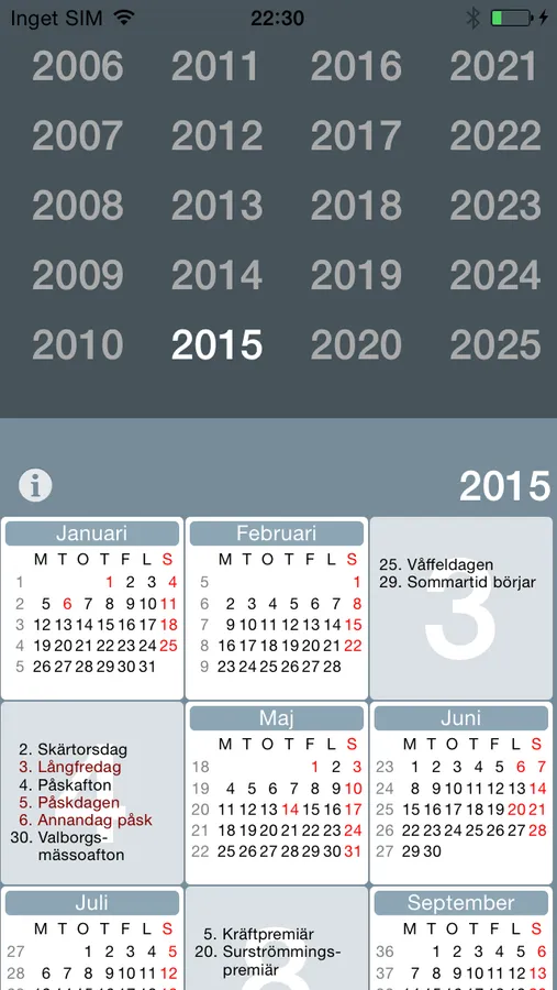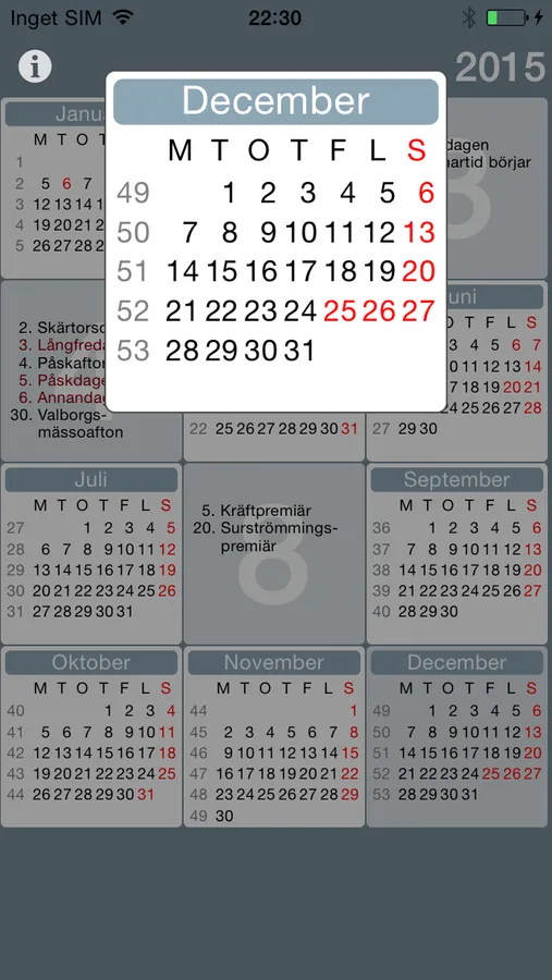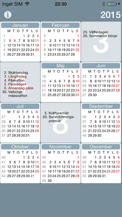 A quick and easy view of a whole year. Instantly see week numbers, weekdays, months, years and Swedish holidays.