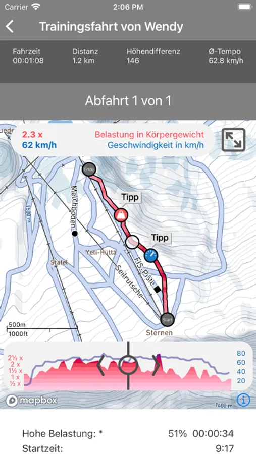 • Aufzeichnung Track im Schneesportgebiet mit Verlauf der Belastungen und Geschwindigkeiten.