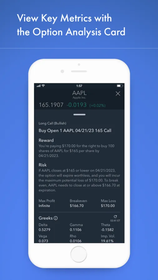 View key metrics with the options analytics tool: Greeks, IV, Max Profit/Loss & Breakeven.