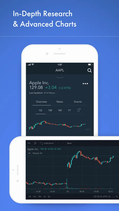Advanced charts can be converted to landscape mode with indicator overlays to track stocks