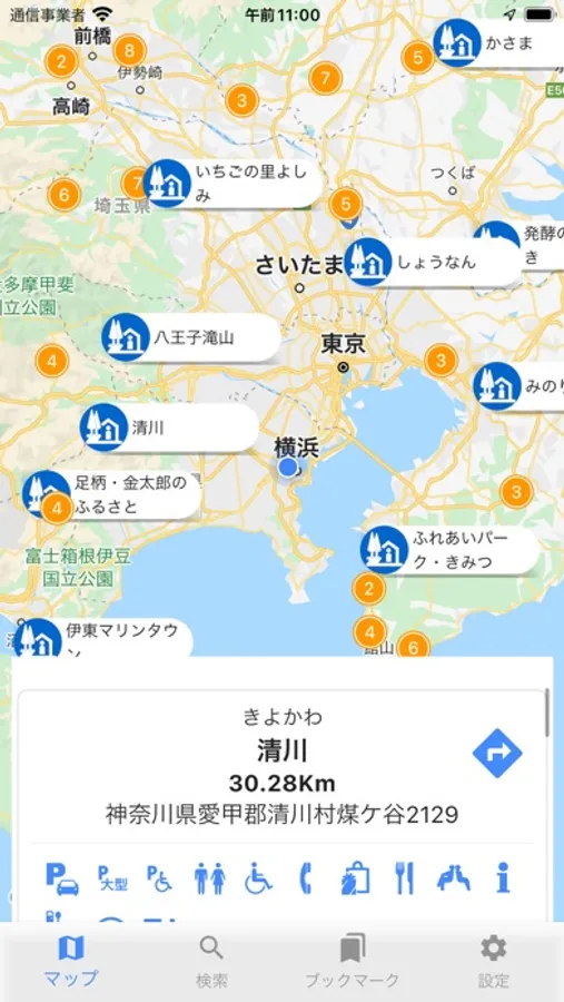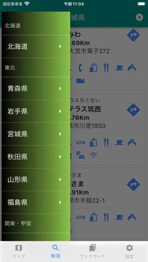 2, Search function: You can search service area by inputting kanji, kana, or by prefecture.