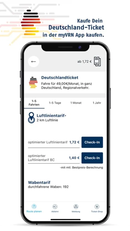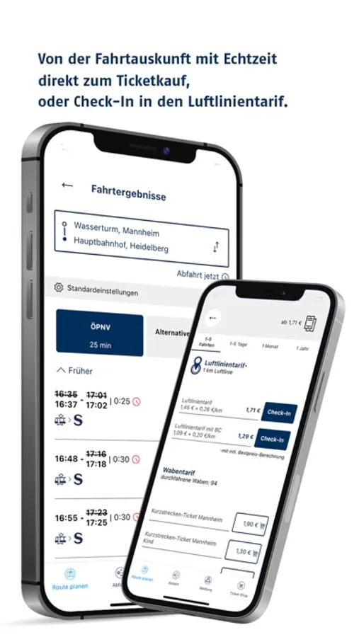 …travel within the Verkehrsverbund Rhein-Neckar Region without any knowledge of tariffs. Simply check in and recrive always at the best price though the air-distance tariff.