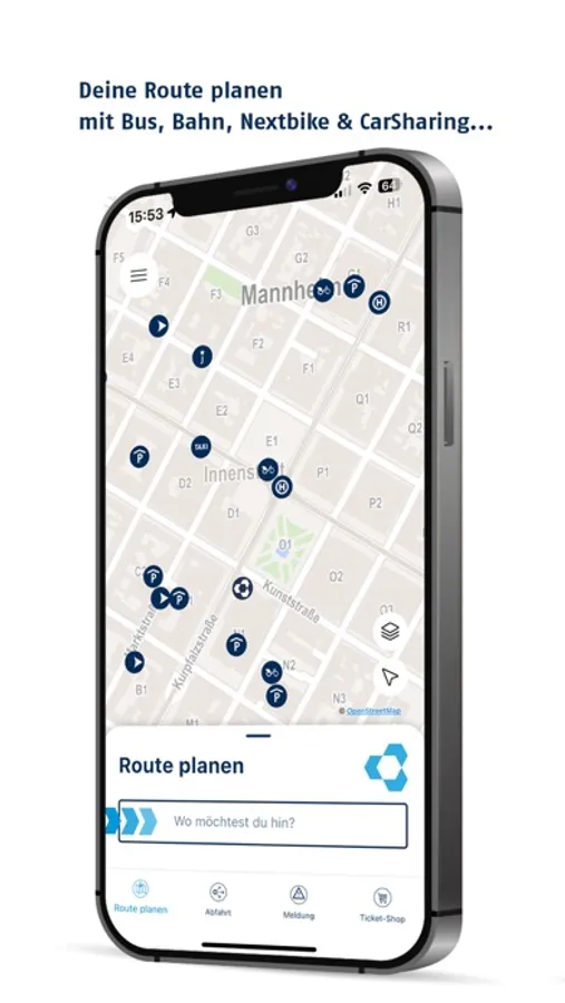 Journey information with classic public transport or as a multimodal route chain with alternative mobility providers such as TIER, VRNnextbike and car sharing providers (JoeCar, Stadtmobil, DB-Flinkster).