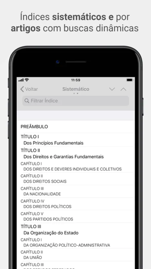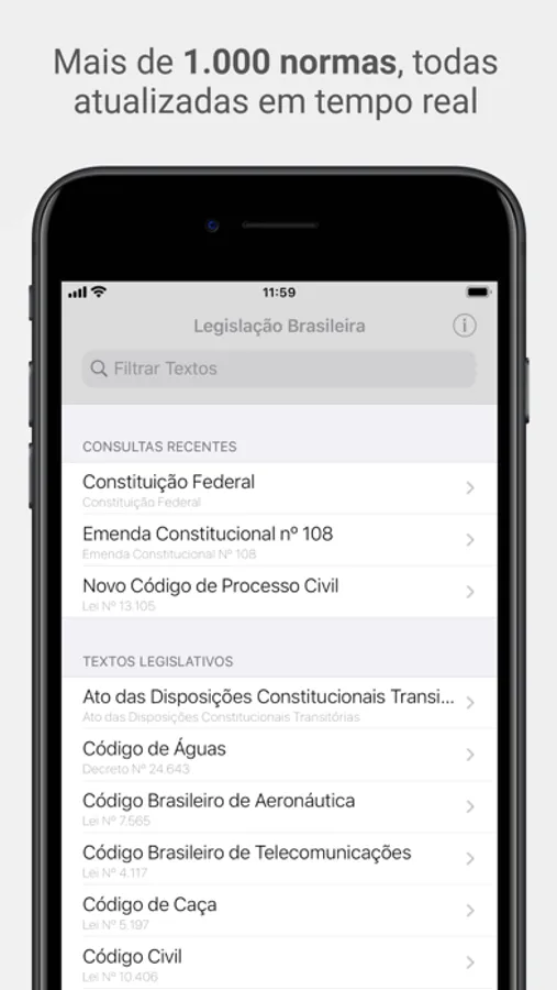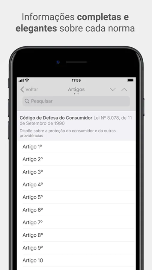 - Navegação Rápida e Intuitiva: O aplicativo foi construído tendo em mente a navegação rápida pelos textos. Desta forma, a tela de seleção de artigos permite deslocamento rápido e, ainda, filtragem por números. Ir para o Artigo 2.001 do Código Civil, por exemplo, é um piscar de olhos.