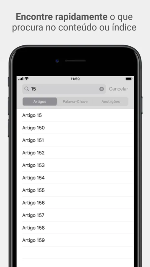 - Pesquisa de Palavras-Chave: A pesquisa do aplicativo não se limita a indicar os artigos que contêm a(s) palavra(s) procurada(s). Além disto, os termos são realçados e o texto é deslocado para a primeira ocorrência da procura.
