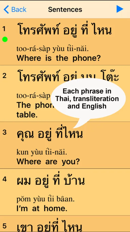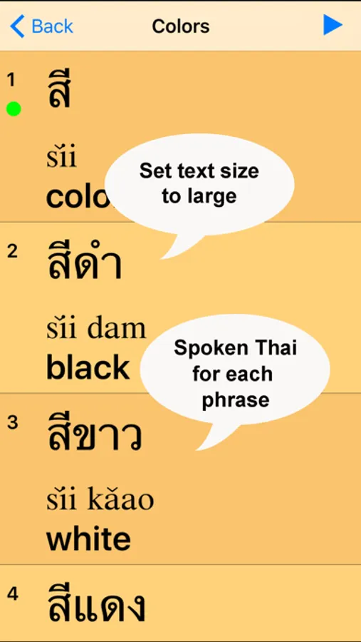 For beginning Thai students, or those who want to improve their basic Thai. * Clear recordings of native Thais speaking each of the 3,000 words and phrases. * Examples of the five tones. * Increase size of text. * Show or hide English text. * No data charges once you download the app. * Play a phrase over and over, or autoplay an entire lesson. * Test your knowledge with built-in exercises. * English voice can be turned on or off. * Each item is presented in Thai, transliteration and English. * Detailed HELP section. * Learn Thai from Benjawan Becker and Paiboon Publishing.