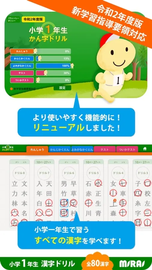 In accordance with the 2020 revised elementary school curriculum guidelines, this app covers 80 kanji learned in the first grade of elementary school.