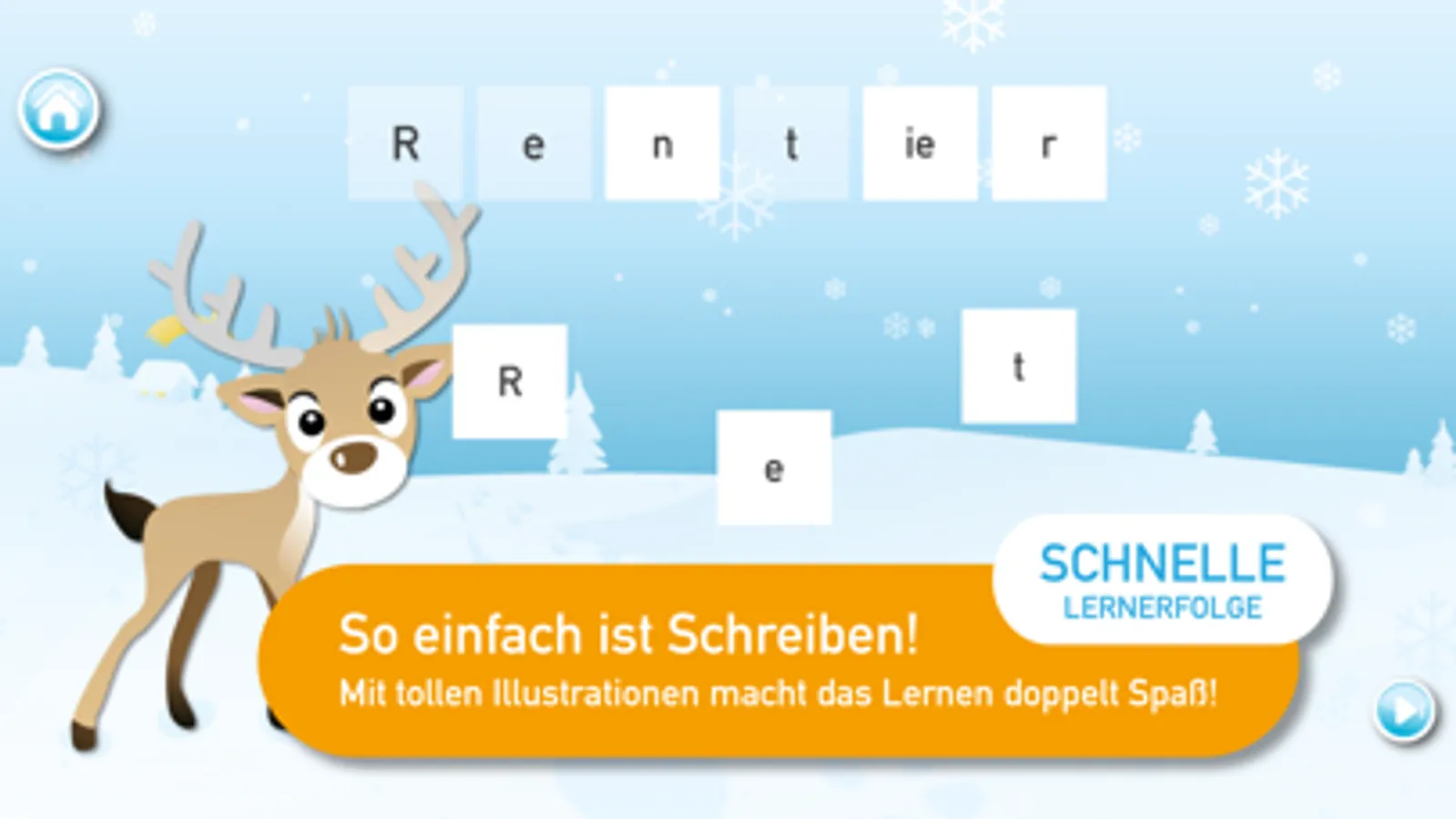 Bei dieser Kinder-App steht spielerisches Lernen von Buchstaben, Lauten und Wörtern an erster Stelle. So lernen deine Kids ganz nebenbei die Bedeutung einzelner Buchstaben und die Schreibweise einzelner Wörter. Jeder Buchstabe oder Laut und sogar die Namen der süßen Weihnachtsabbildungen werden vorgesprochen. So werden schon ganz kleine Kinder spielerisch beim Sprechen lernen unterstützt. Richtig geschriebene Wörter werden mit lustigen Sounds und kleinen Animationen belohnt.