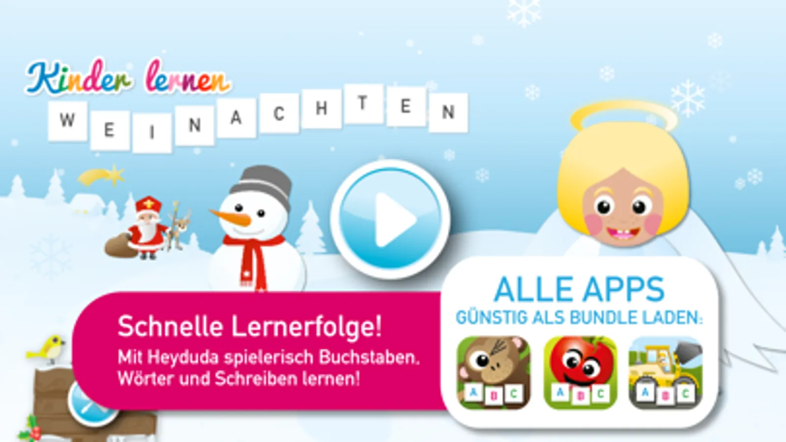 Mit „Kinder lernen Weihnachten“ einfach spielerisch SCHREIBEN und LESEN lernen. Dieses Spiel ist eine kostenlose Light-Version mit Weihnachtsmotiven aus der erfolgreichen "Kinder lernen..." App-Serie von Heyduda!