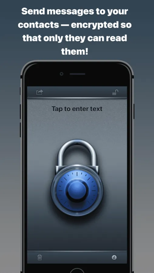 Send messages to your friends and colleagues – encrypted so that only they can read the message. Tap and type your message, and with one tap you can encrypt and then send your message, or copy it to the clipboard for pasting in to another application. Shake to clear your message.