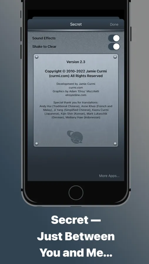 Secret works in any language, and even with emoji. Secret is also fully localised in English, French, Japanese, Italian, Greek, Spanish, Malay, Indonesian, German, Korean, and Simplified and Traditional Chinese.